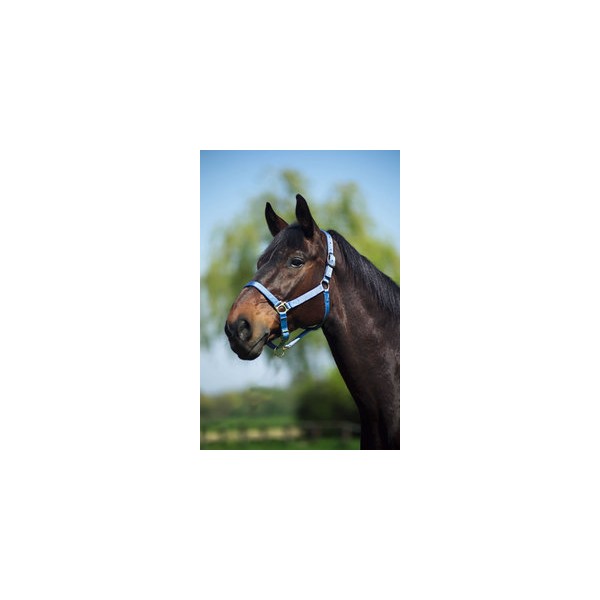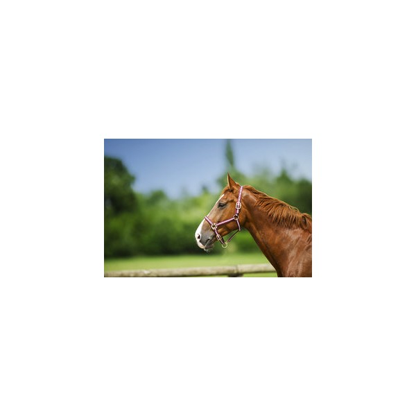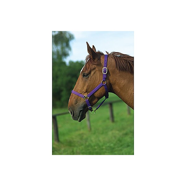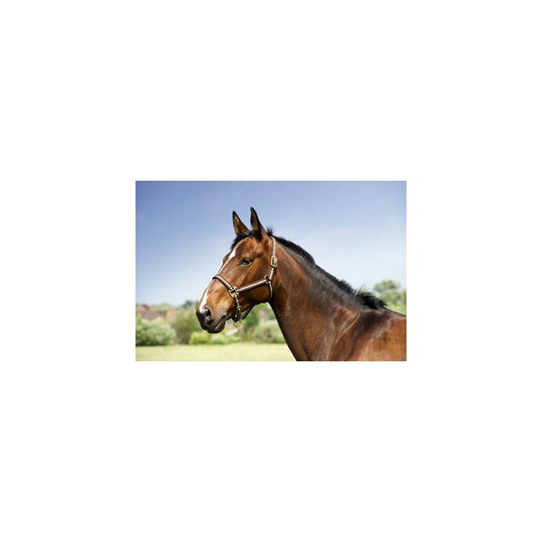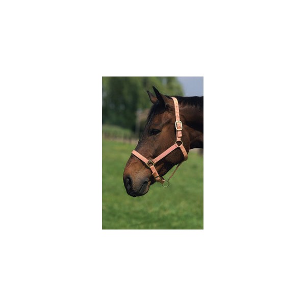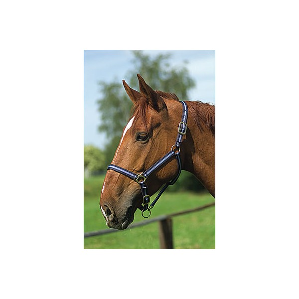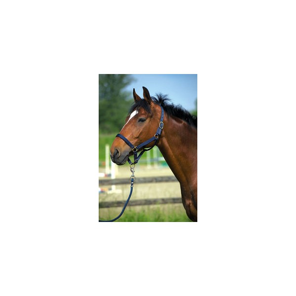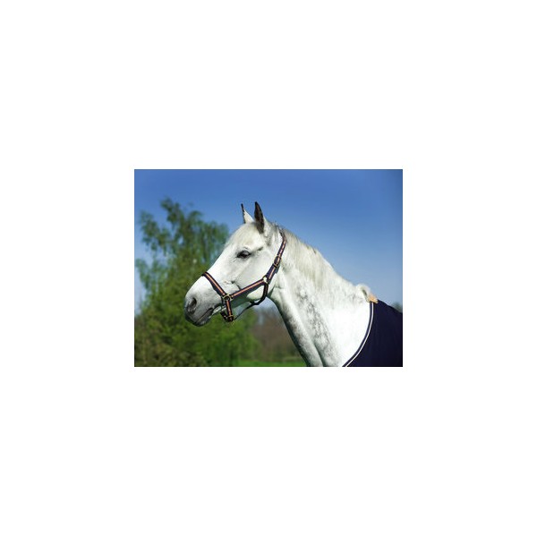 Cabresto espessura de nylon preto com forro de couro de búfalo split e ajustes na focinheira e do capacete. Focinheira e mão ajustáveis com fivelas língua.