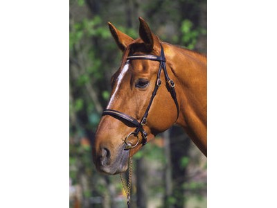 Cabeçada de apresentação em couro de búfalo tingido com anilina browband e focinheira decorado com uma bracelete de ouro. Cabeçada de apresentação com alça de couro e cadeias duplas, fixando pressão maxilares. Fivelas e correntes de metal dourado.