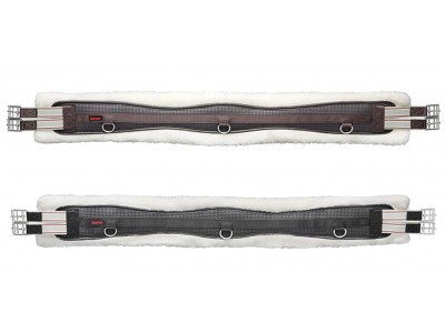 Em neoprene curvo, forrado com pele de ovelha sintética, com faixas elásticas contrastantes nos dois lados, anel em D no centro e nas duas semestralidades.
