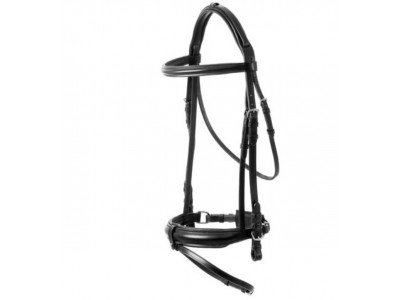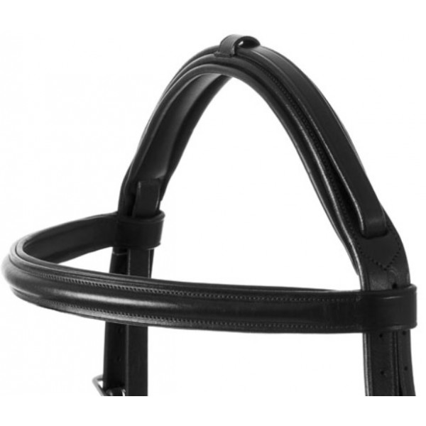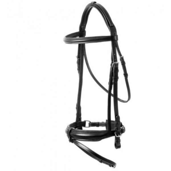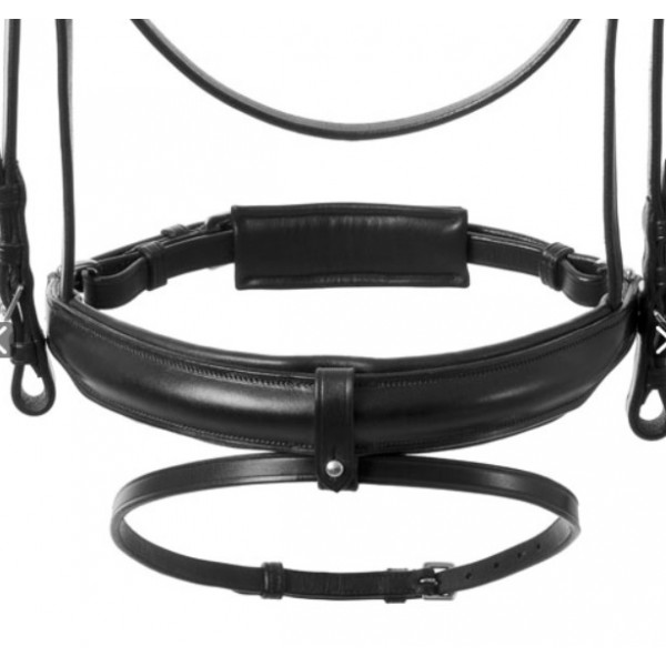 Cabeçada de Bridão. Cabeceira acolchoada com focinheira no exterior para maior conforto do cavalo. Focinheira anatômica composta por duas peças ajustáveis muito largas e acolchoadas com fecho removível.
