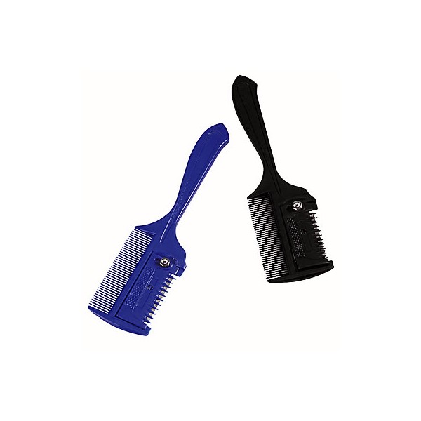 Pente de plástico com uma fila de dentes e uma razoável lámina removível com parafusos de segurança e com 18 centímetros de comprimento.