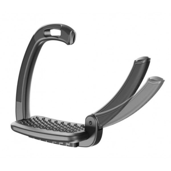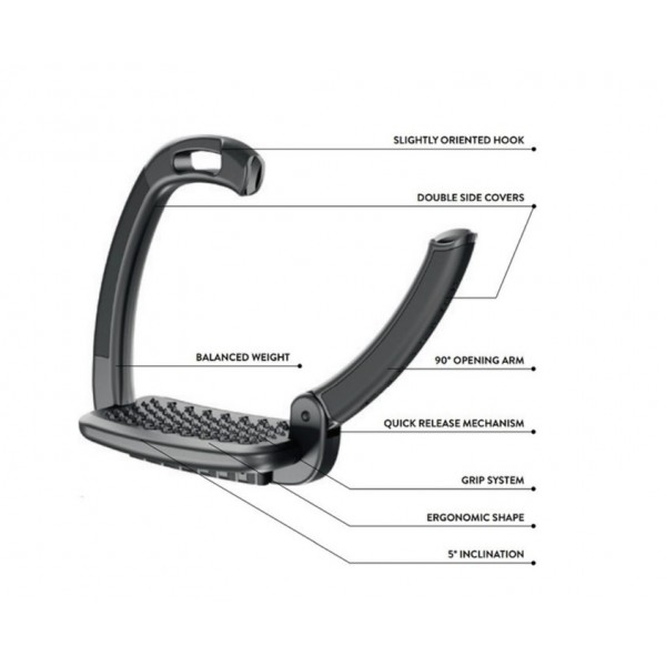 Equipados com braço lateral em poliuretano com abertura de 90° , esses estribos permitem a liberação do pé em caso de queda para maior segurança do cavaleiro.