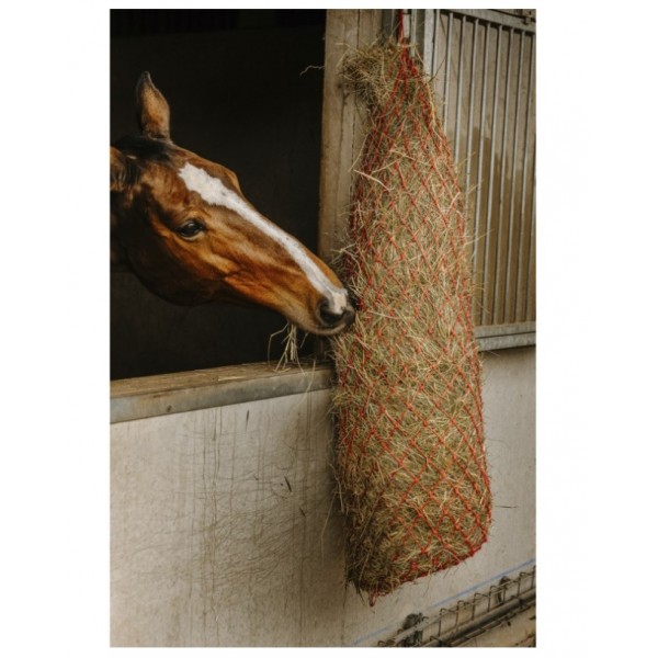 Com aberturas de malha de aproximadamente 4 cm quadrados, garante uma distribuição controlada do feno para promover um consumo lento.